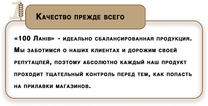 ТМ «100 Ланів» использует в своем производите только отборное зерно высокого качества. Употребляя бакалейную продукцию «100 Ланів» Вы можете быть уверены, что Ваш организм получает полезные витамины и вещества с каждым приёмом пищи, где присутствует наш продукт.